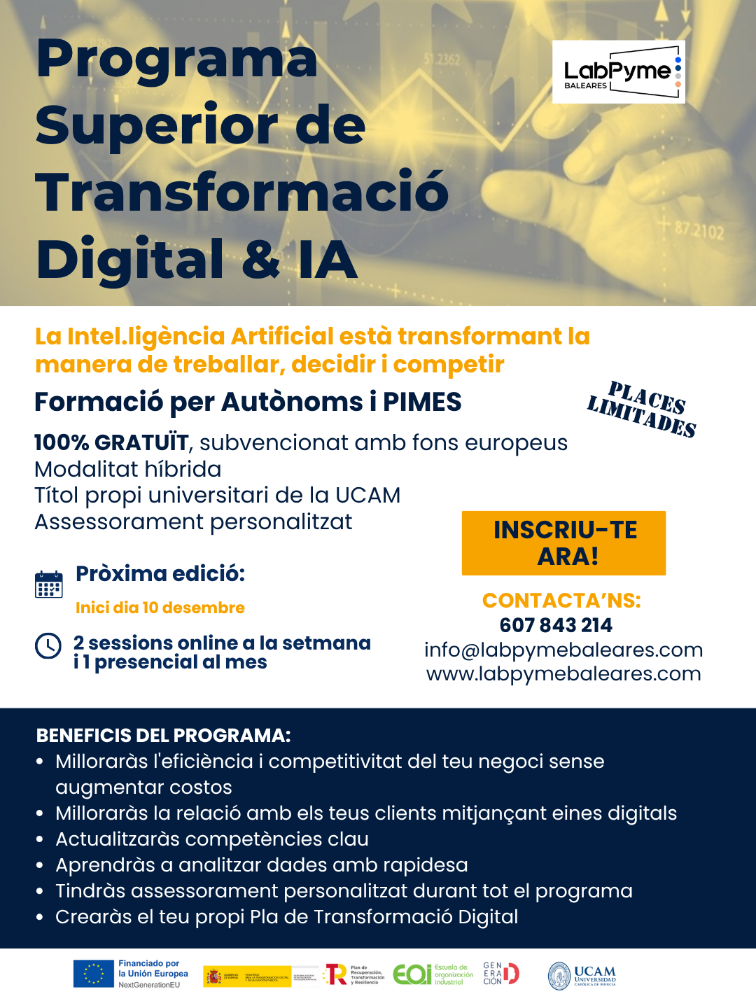 El 10 de diciembre de 2025 comenzamos la 10ª edición de esta formación, exclusiva para las Illes Balears y 100% subvencionada gracias a fondos europeos, impartido por Labpyme Baleares a través de la EOI – Escuela de Organización Industrial (dependiente del Ministerio de Industria).