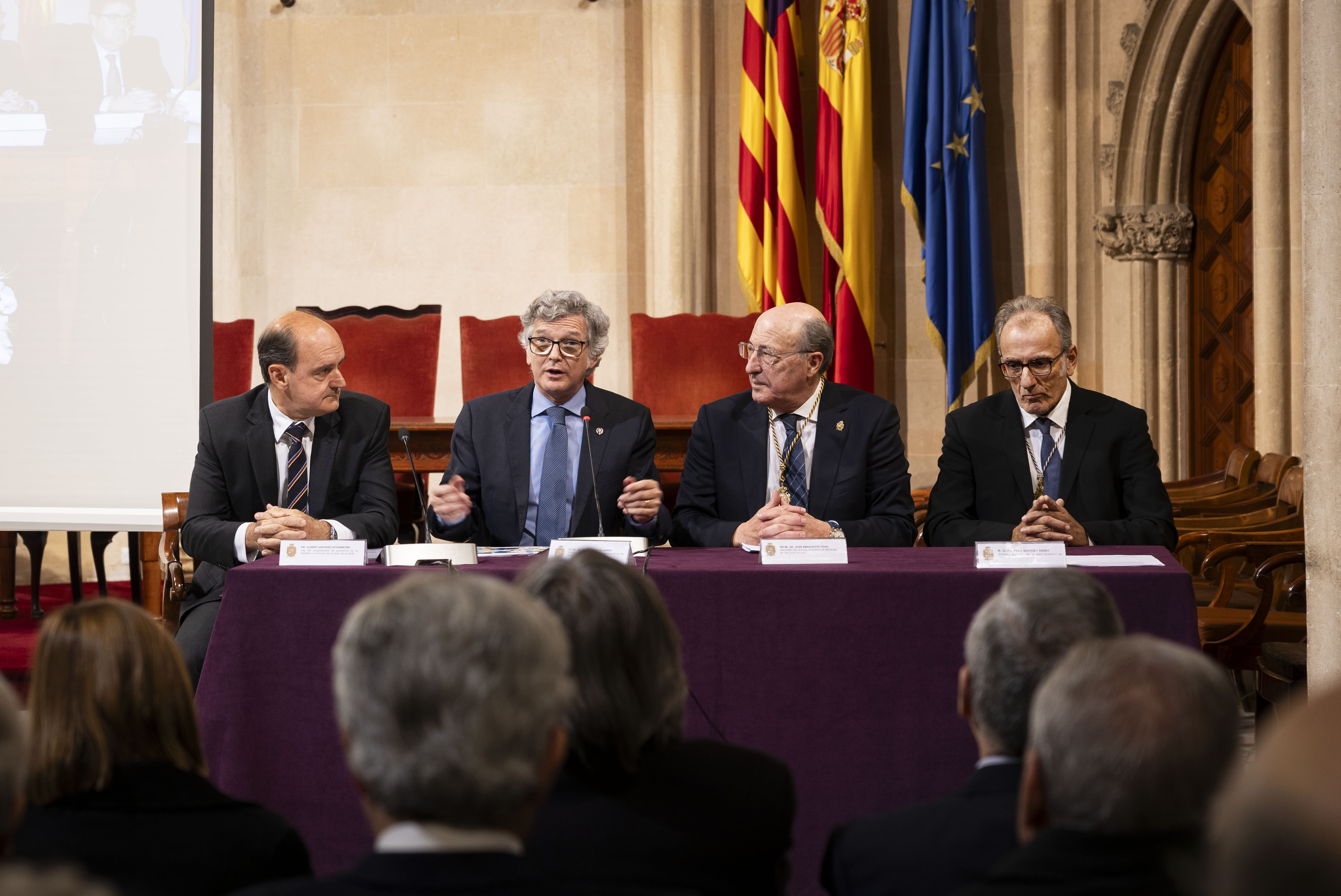 El acto estuvo presidido por el doctor Joan Besalduch Vidal, presidente de la RAMIB, y contó con las intervenciones del doctor Pere Riutort, académico numerario; Alberto Anguera, hijo del homenajeado y veterinario; y Ramon García, presidente del COVIB.